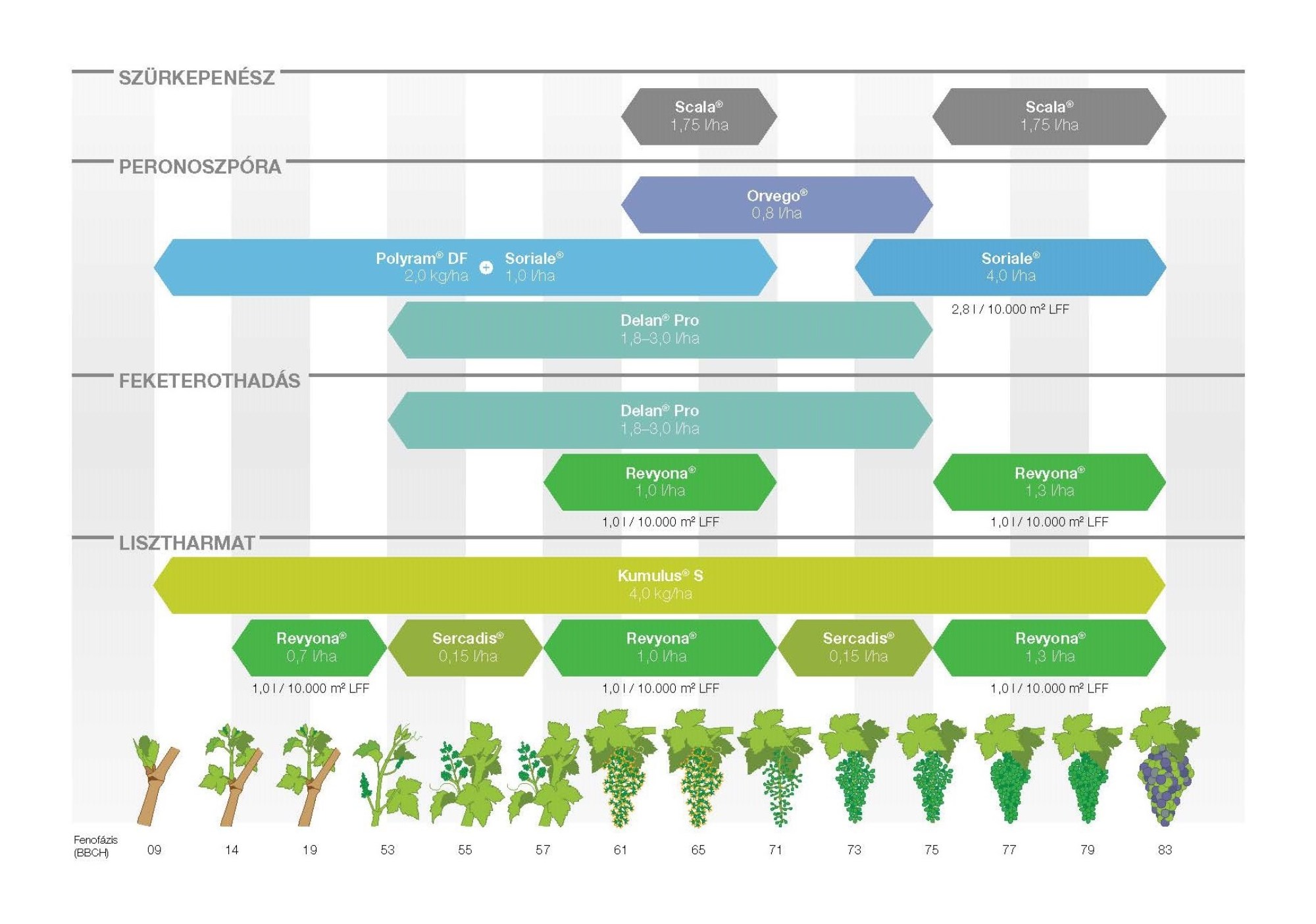A Revyona® dózisát a kultúrnövény lombozatának mérete határozza meg. Ennek köszönhetően egységnyi növényfelületre mindig azonos hatóanyagmennyiséget juttathatunk ki. További előnye, hogy a szezon kezdeti túldozírozás elkerülésével jelentős költségmegtakarítás érhető el, hiszen a vegetációs időszak első felében, amikor kisebb a lombfelület, alacsonyabb dózist használhatunk, míg a teljes lombozat kifejlődése esetén a magasabb dózist alkalmazzunk. A lombfalfelület és a dózis számításához használja külön erre a célra fejlesztett kalkulátorunkat: